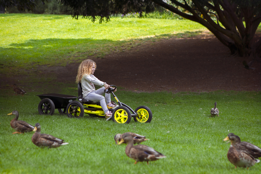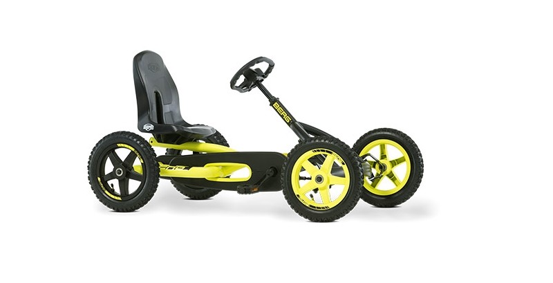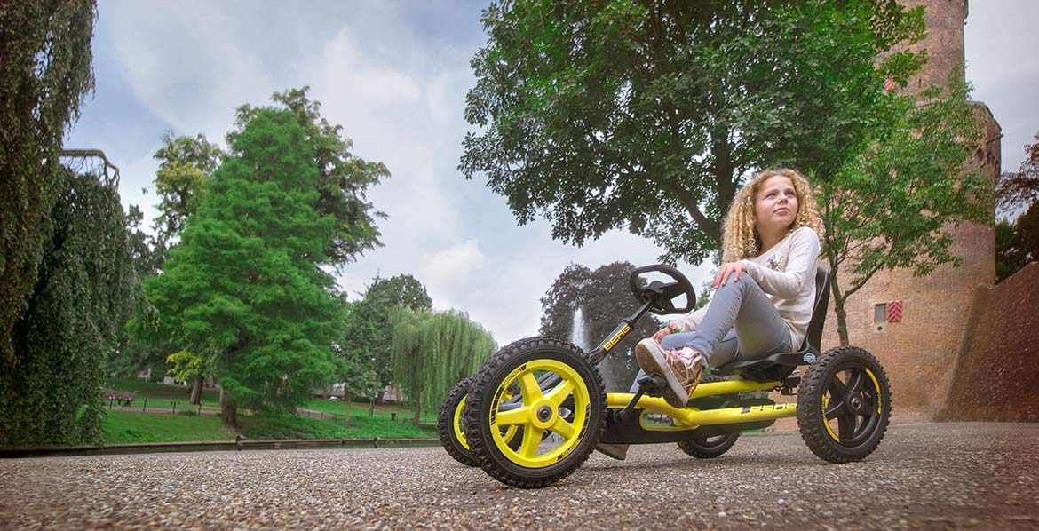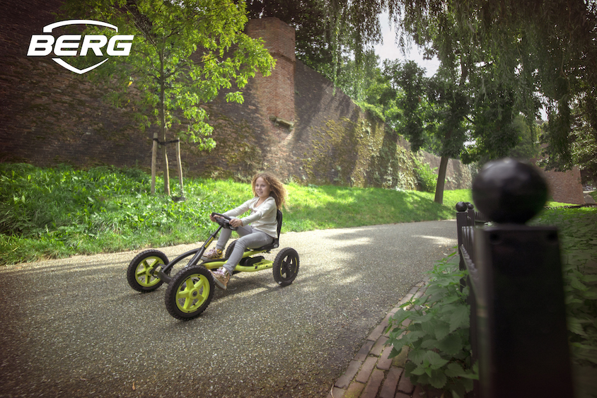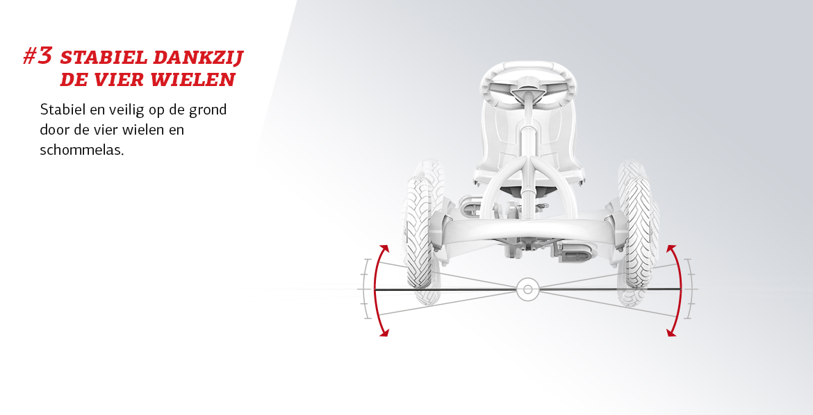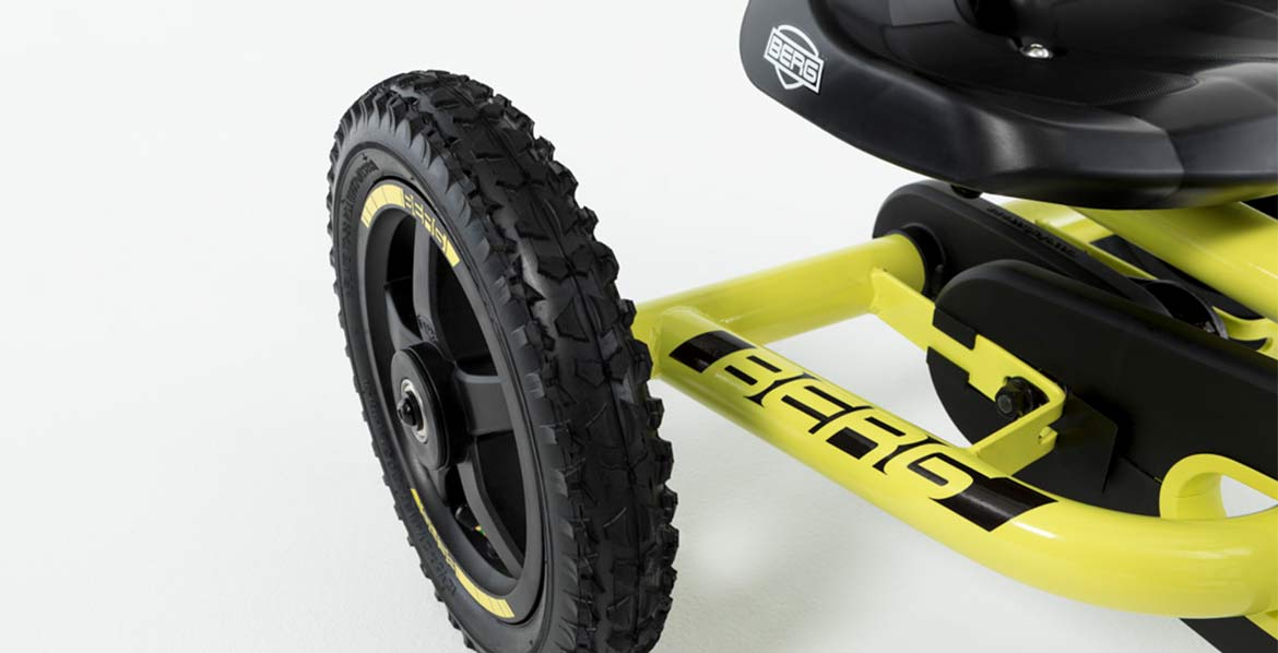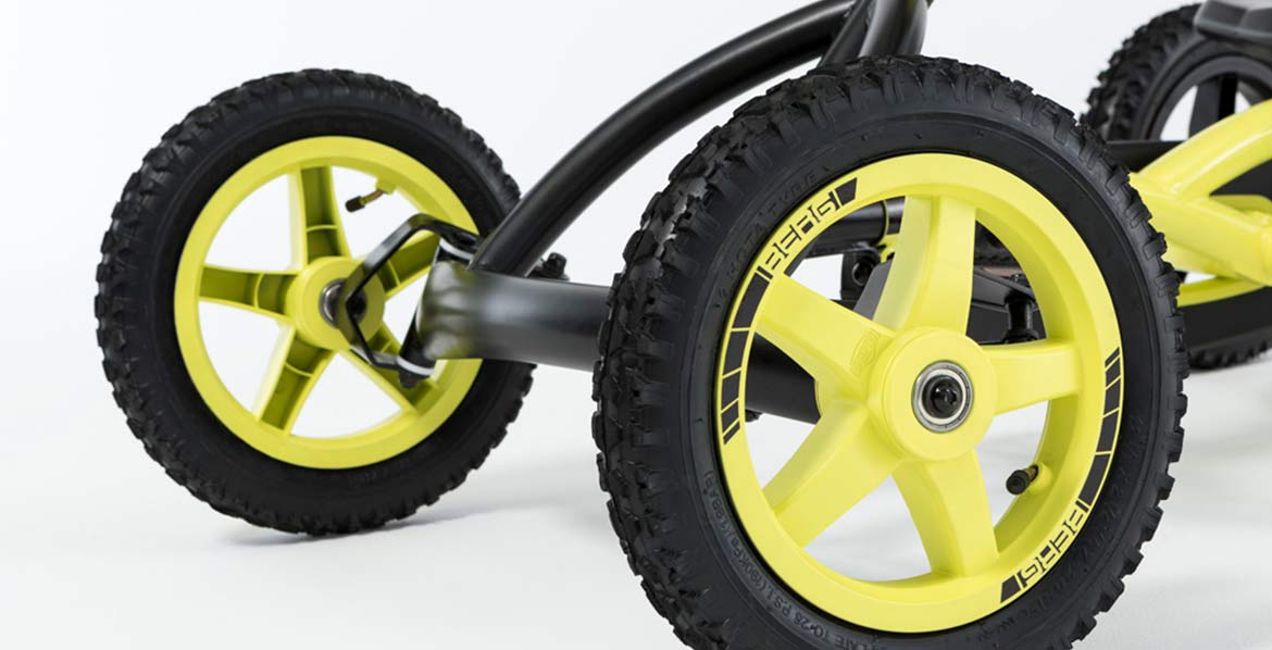 De BERG Buddy staat stevig op de grond door de schommel-as. Met deze skelter rijdt je kindje eenvoudig weg door het BFR-systeem.