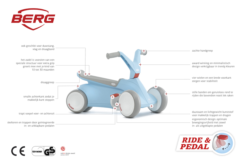 Door de vormgeving kan je kindje de BERG GO² eenvoudig als loopauto gebruiken zonder dat de pedalen of achterwielen in de weg zitten. Klap de trappers uit wanneer je kind toe is aan de volgende fase. Dan kan jouw dreumes heerlijk leren rondrijden op de BERG GO². Je hoeft niet bang te zijn dat je kindje omvalt, want de BERG GO² staat stevig op de grond door de vier wielen. Dit is wel zo veilig!