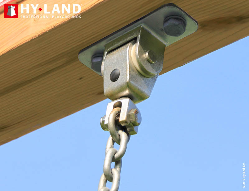 Gecertificeerde schommel accessoire zeer geschikt voor commerciële speeltoestellen. Gemaakt van schokabsorberende polymeer verstevigd met een aluminium kern voor kracht en veiligheid. Thermisch verzinkte stalen schommelkettingen met extra kleine schakels voorkomen beknelling voor de vingers. Roestvrijstalen schommel hangers met nylon laag; lage frictie, geen geluid en vereisen geen smering. Check ook het alternatief voor houten schommel accessoires; S-Swing Nest.