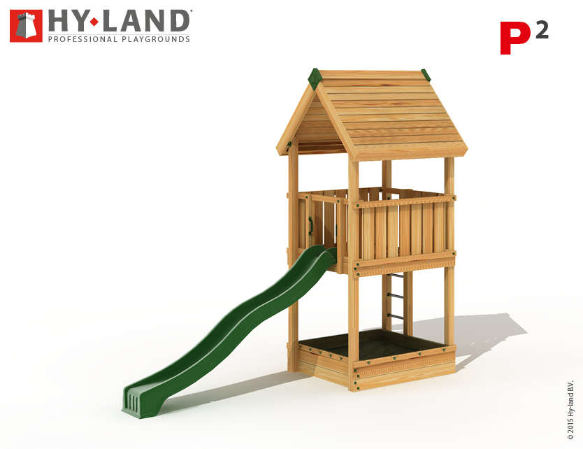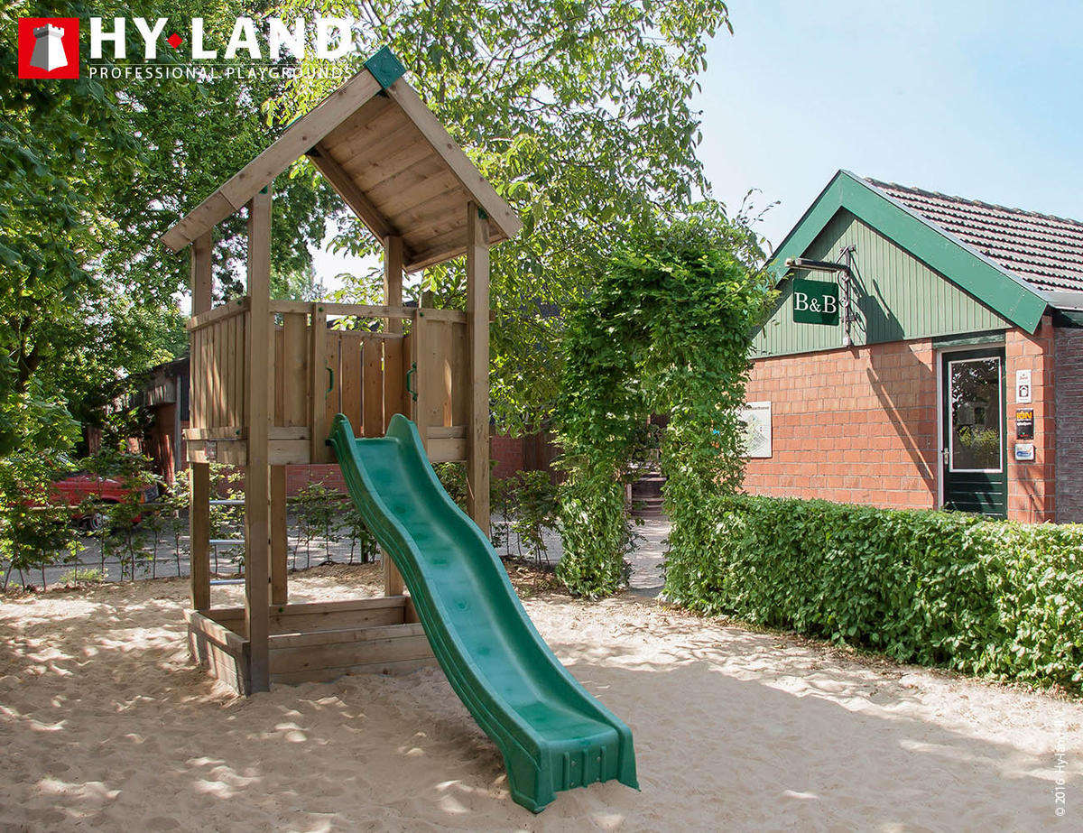 Voor een veilige speelomgeving dient er rondom de speeltoren een schok absoberende ruimte van 2 meter rond het speeltoestel gebruikt te worden. Dit kan gras, boomschors of rubberen tegels zijn. Om de speeltoren extra te verstevigen raden wij aan om 2 sets Hy-Land Grondankers te gebruiken.
