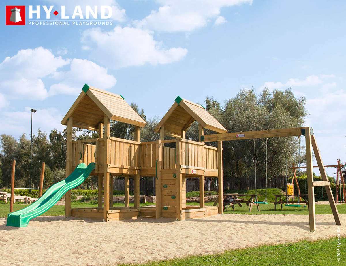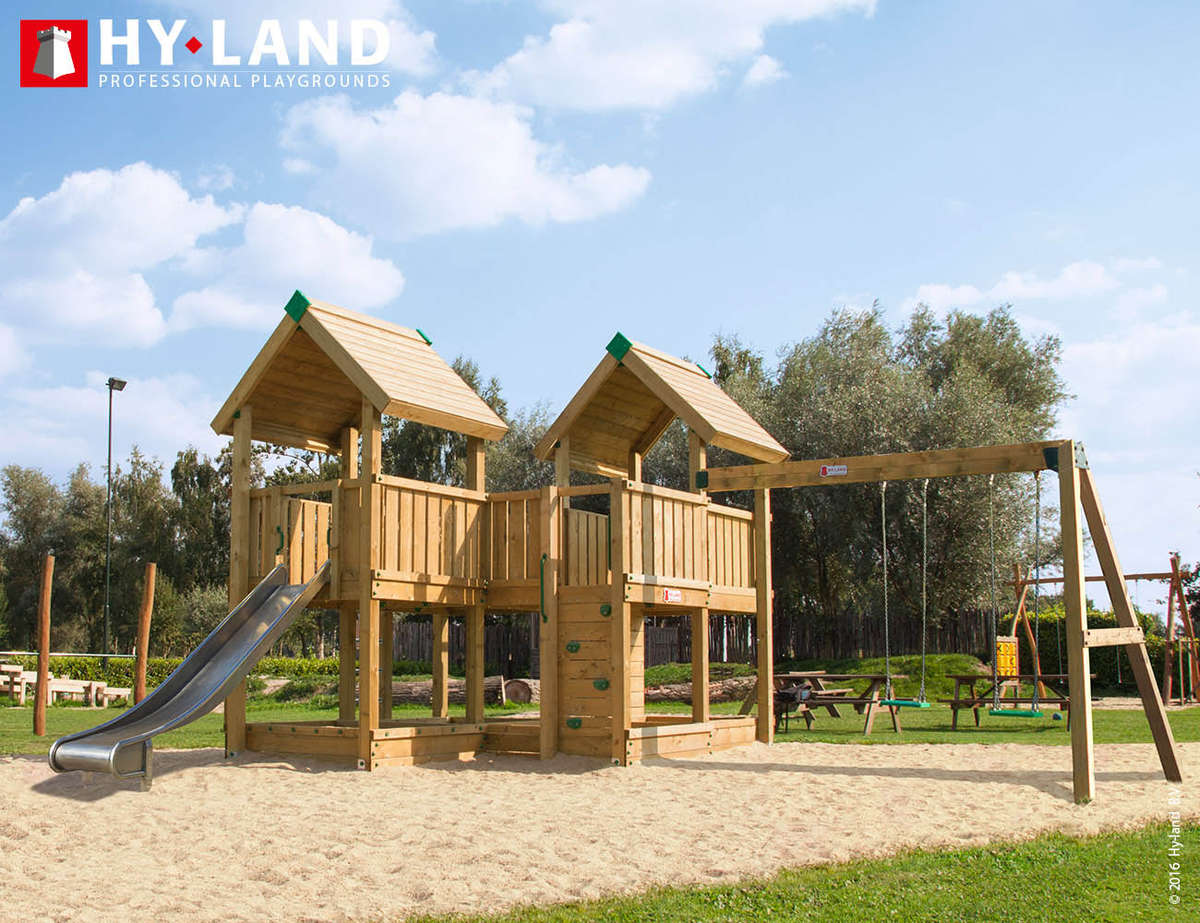 Wat is nu leuker dan dat de kinderen veilig buitenspelen samen met vriendjes en vriendinnetjes in een sociale en creative omgeving. Hy-land heeft hiervoor houten speeltoestellen gemaakt, die precies aan die eissen voldoen. De speeltoren is uitgerust met een glijbaan. Doordat de speeltoren TÜF en EN 1176 gekeurd is, is de speeltoren voor zowel particulier als voor openbare doeleinden te gebruiken.