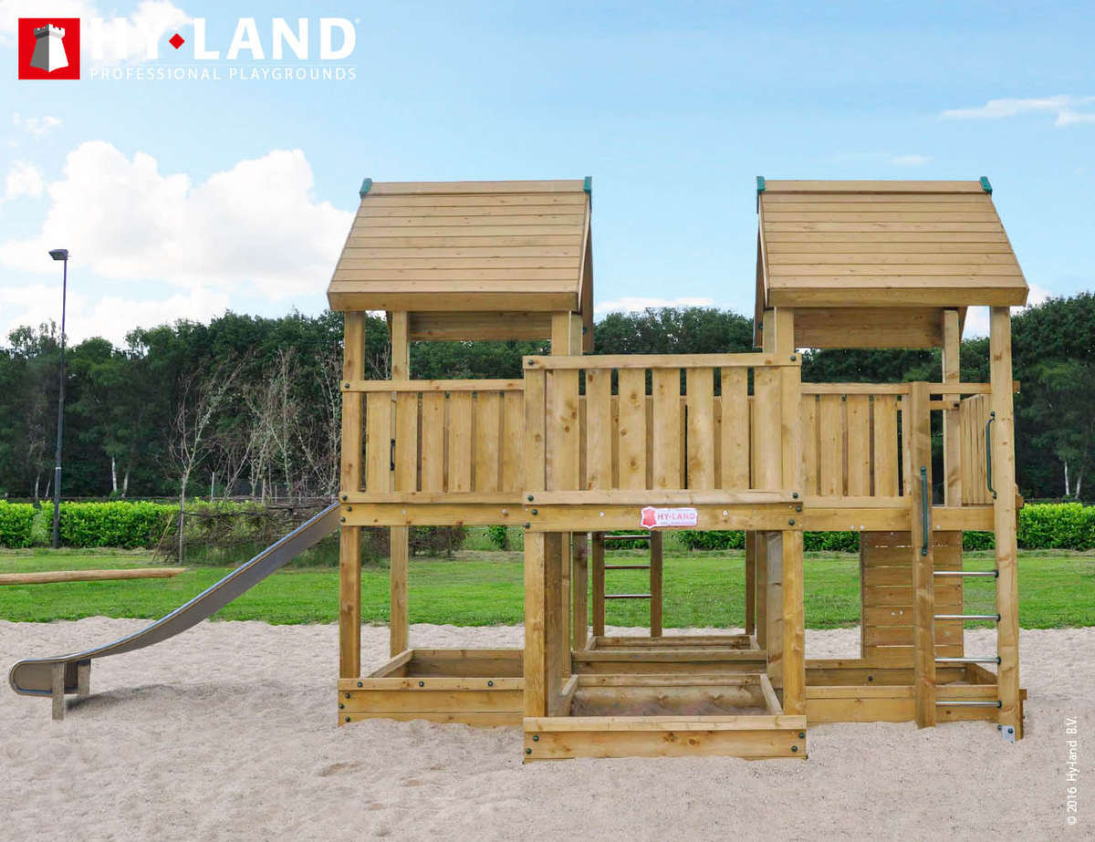 Wat is nu leuker dan dat de kinderen veilig buitenspelen samen met vriendjes en vriendinnetjes in een sociale en creative omgeving. Hy-land heeft hiervoor houten speeltoestellen gemaakt, die precies aan die eisen voldoen. De speeltoren is uitgerust met een glijbaan. Doordat de speeltoren TÜF en EN 1176 gekeurd is, is de speeltoren voor zowel particulier als voor openbare doeleinden te gebruiken.