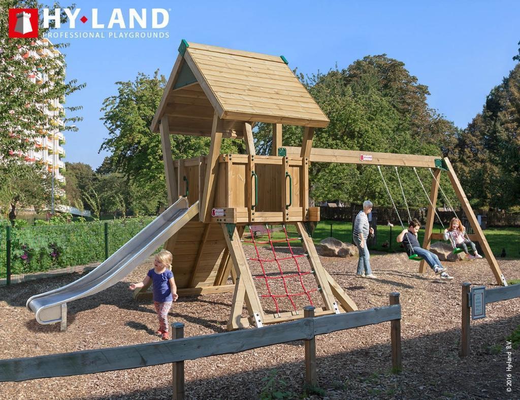 Wat is nu leuker dan dat de kinderen veilig buitenspelen samen met vriendjes en vriendinnetjes in een sociale en creative omgeving. Hy-land heeft hiervoor houten speeltoestellen gemaakt, die precies aan die eissen voldoen. De speeltoren is uitgerust met een glijbaan. Doordat de speeltoren TÜF en EN 1176 gekeurd is, is de speeltoren voor zowel particulier als voor openbare doeleinden te gebruiken.
