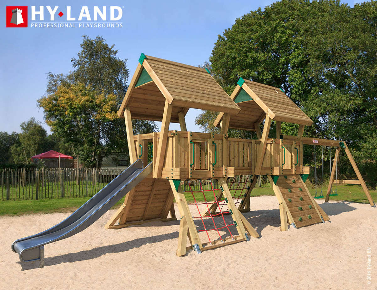 Wat is nu leuker dan dat de kinderen veilig buitenspelen samen met vriendjes en vriendinnetjes in een sociale en creative omgeving. Hy-land heeft hiervoor houten speeltoestellen gemaakt, die precies aan die eissen voldoen. De speeltoren is uitgerust met een glijbaan. Doordat de speeltoren TÜF en EN 1176 gekeurd is, is de speeltoren voor zowel particulier als voor openbare doeleinden te gebruiken.