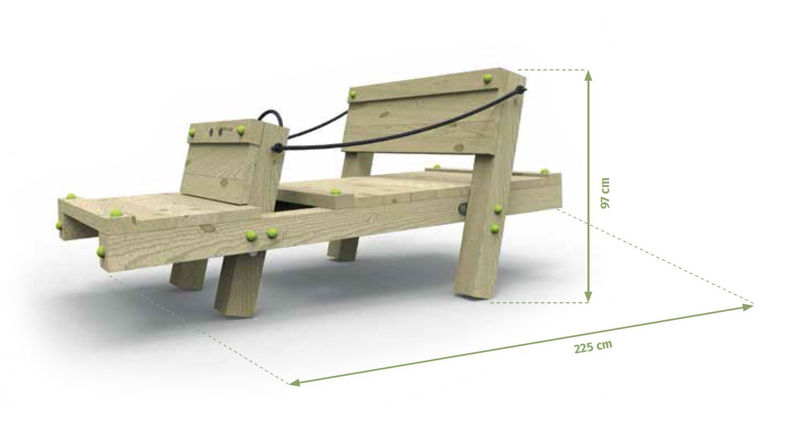 - Gebruikt hout is Vuren geïmpregneerd, met een sterkteklasse van C24. Dit constructiehout is zeer geschikt om onderhoudsvrije speeltoestellen te maken. Het hout wordt op maat gezaagd geleverd met afgeronde hoekjes.