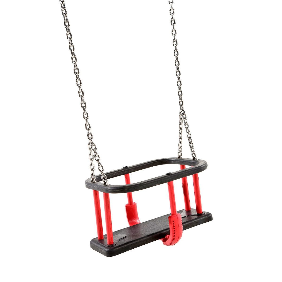 Het rubberen babyzitje ‘Basic’ van KBT wordt plat verpakt geleverd en is ontworpen voor maximale veiligheid en duurzaamheid in speeltuinen en speelomgevingen. Alle onderdelen zijn intern versterkt met metaal of aluminium, wat zorgt voor extra stevigheid en een lange levensduur. Het zitje is uitgerust met J-haken, waardoor het compatibel is met verschillende kettingsets en flexibel inzetbaar is bij montage.