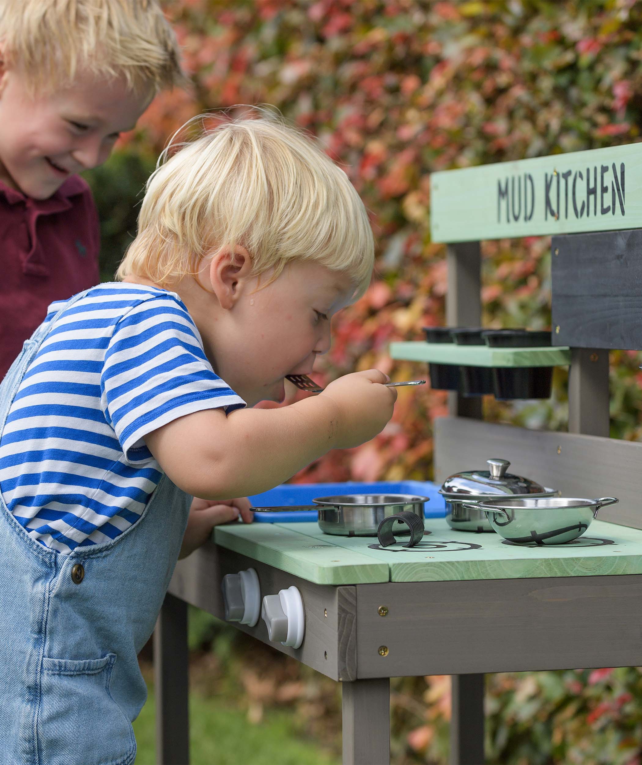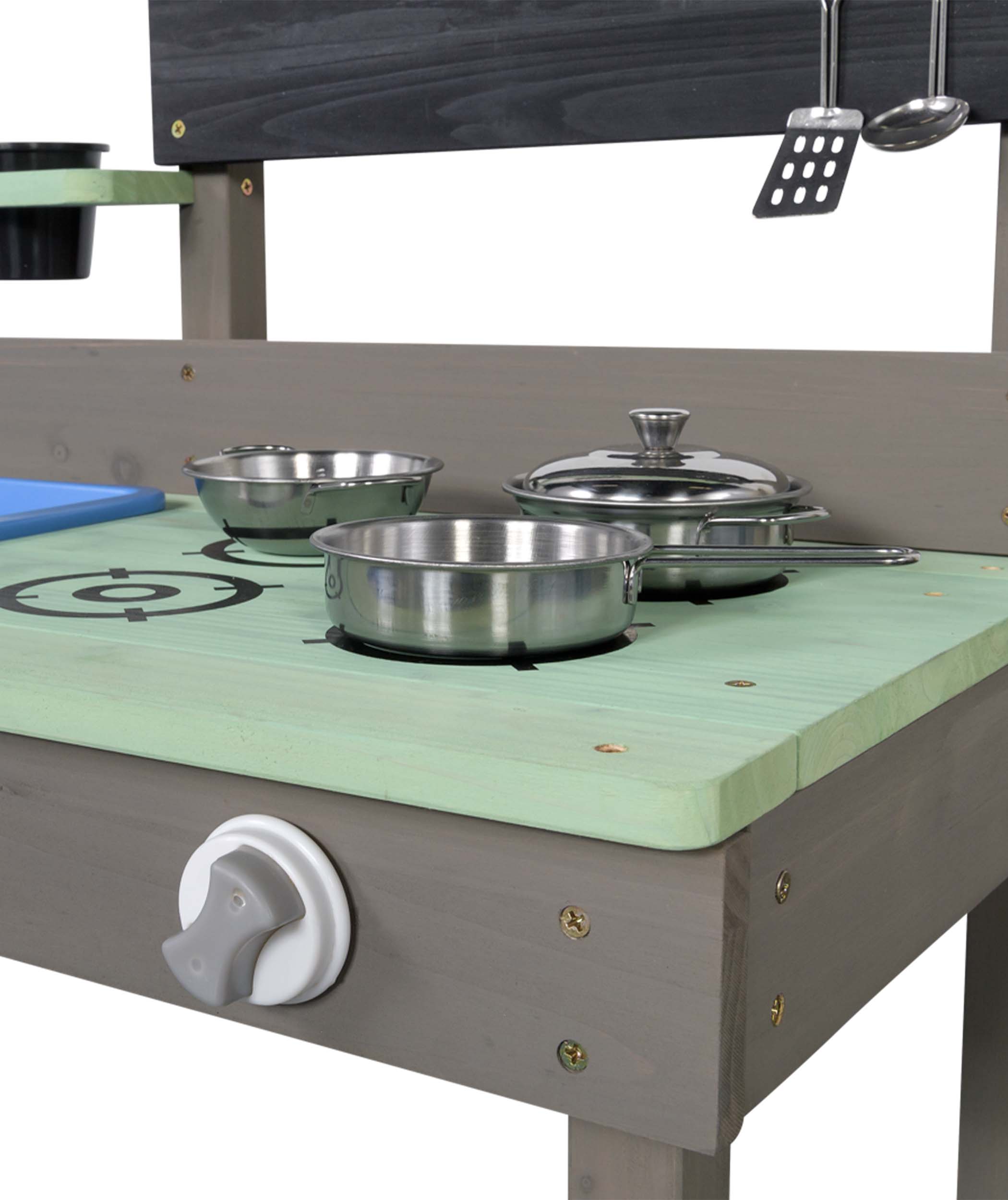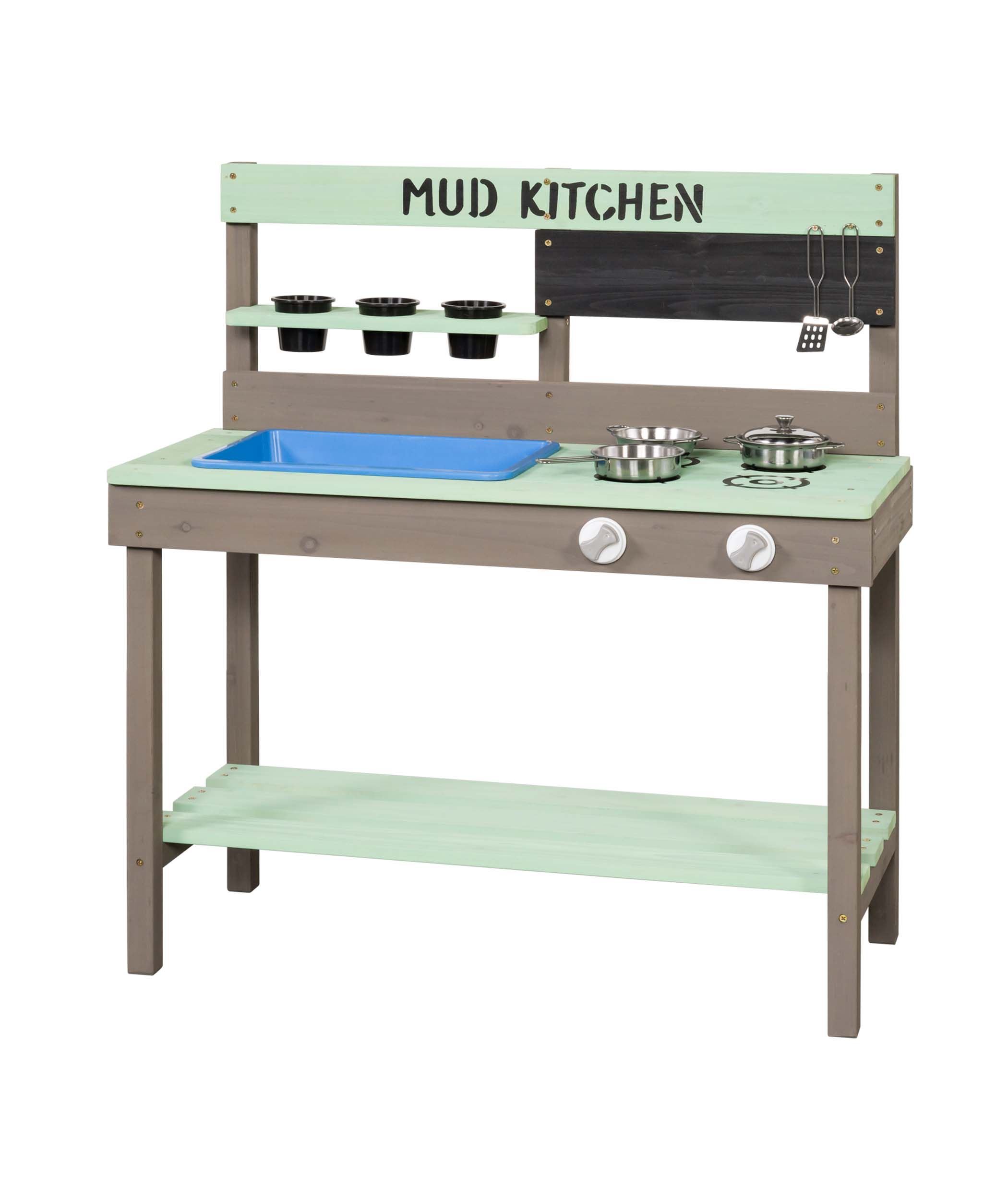 De Mudkitchen is gemaakt van gekleurd FSC-hout. Bloempotten en set keukengerei zijn inbegrepen.