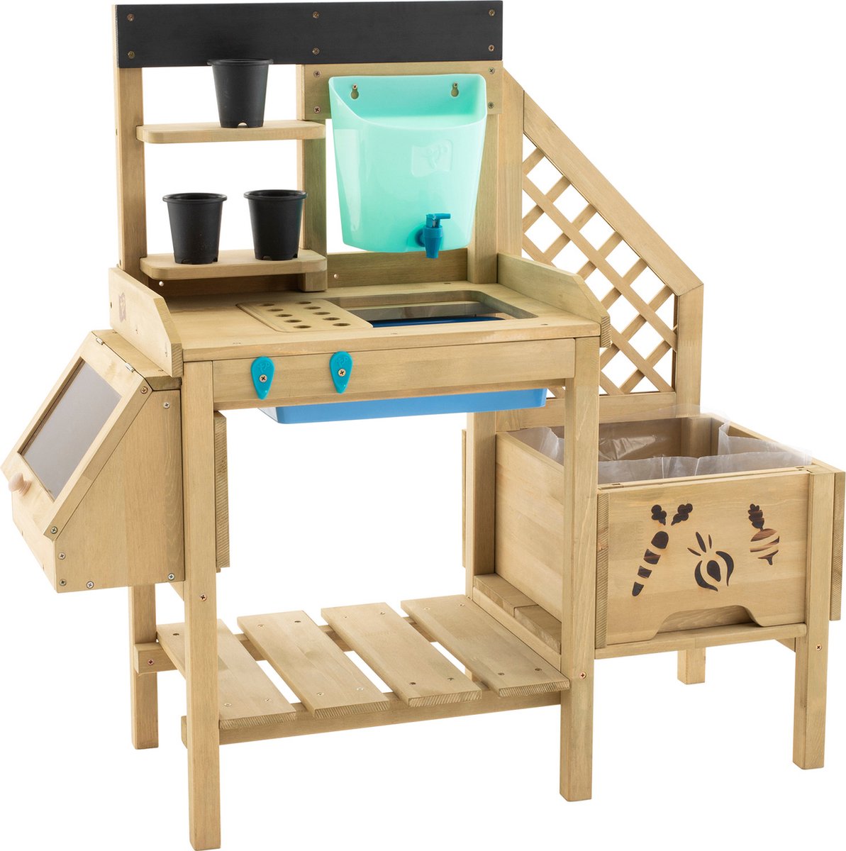 De stevige oppottafel is vervaardigd uit duurzaam FSC-gecertificeerd Europees hout en biedt volop speelmogelijkheden. In het werkblad bevindt zich een kunststof bak die ideaal is voor aarde of water. De ingebouwde regenton met kraantje voegt een realistisch element toe, en kan eenvoudig gevuld worden met water.