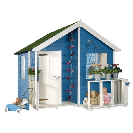 Het dakje loopt door boven het deurtje zodat er een klein luifeltje onstaat. Ook zit er een stukje veranda bij en balkon-rekjes.