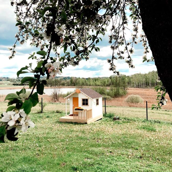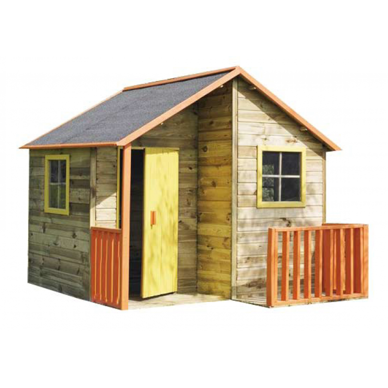 Het houten speelhuis heeft een deur, drie vaste ramen met plastic ruitjes, zwarte bitumen dakleer, set bevestigingsmaterialen en handleiding.