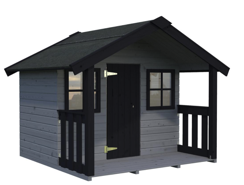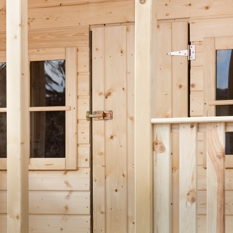 Houten speelhuisje Egel heeft 2 raampjes met veiligheidsplexiglas, een deurtje en veranda.