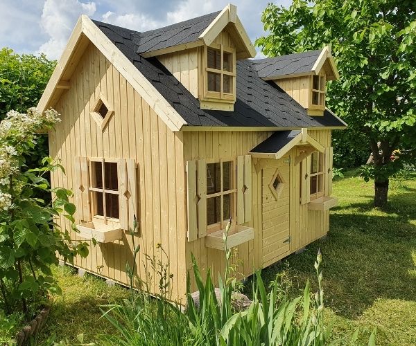 Speelhuisje Libelle heeft 4 ramen van plexiglas en 2 ramen in de dakkapellentjes