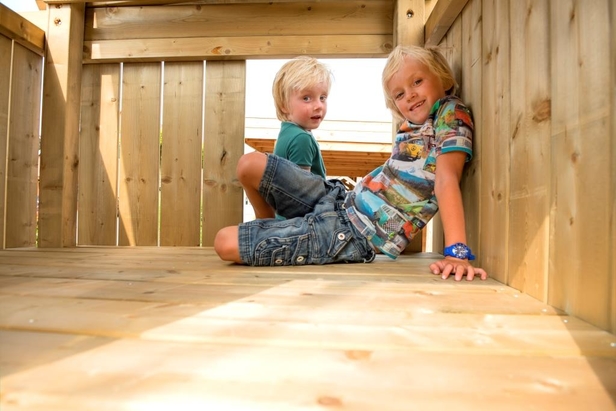 Het speeltoestel is vervaardigd uit Noord-Europees vurenhout en groen geïmpregneerd. Doordat de schommelbalk is geïntegreerd in de constructie, heeft het toestel genoeg aan een staoppervlakte van 130 x 130 cm. Aan de schommelbalk kunt u geweldige schommelaccessoires ophangen met behulp van 4 schommelhaken met karabijnhaak. Eventuele andere speelmogelijkheden (bijvoorbeeld een klimwand) zijn vrij in te delen. Speeltoestel compact wordt standaard geleverd met een zandbak en een veiligheidstrap met platte treden. Ook krijgt u een gratis glijbaan erbij!