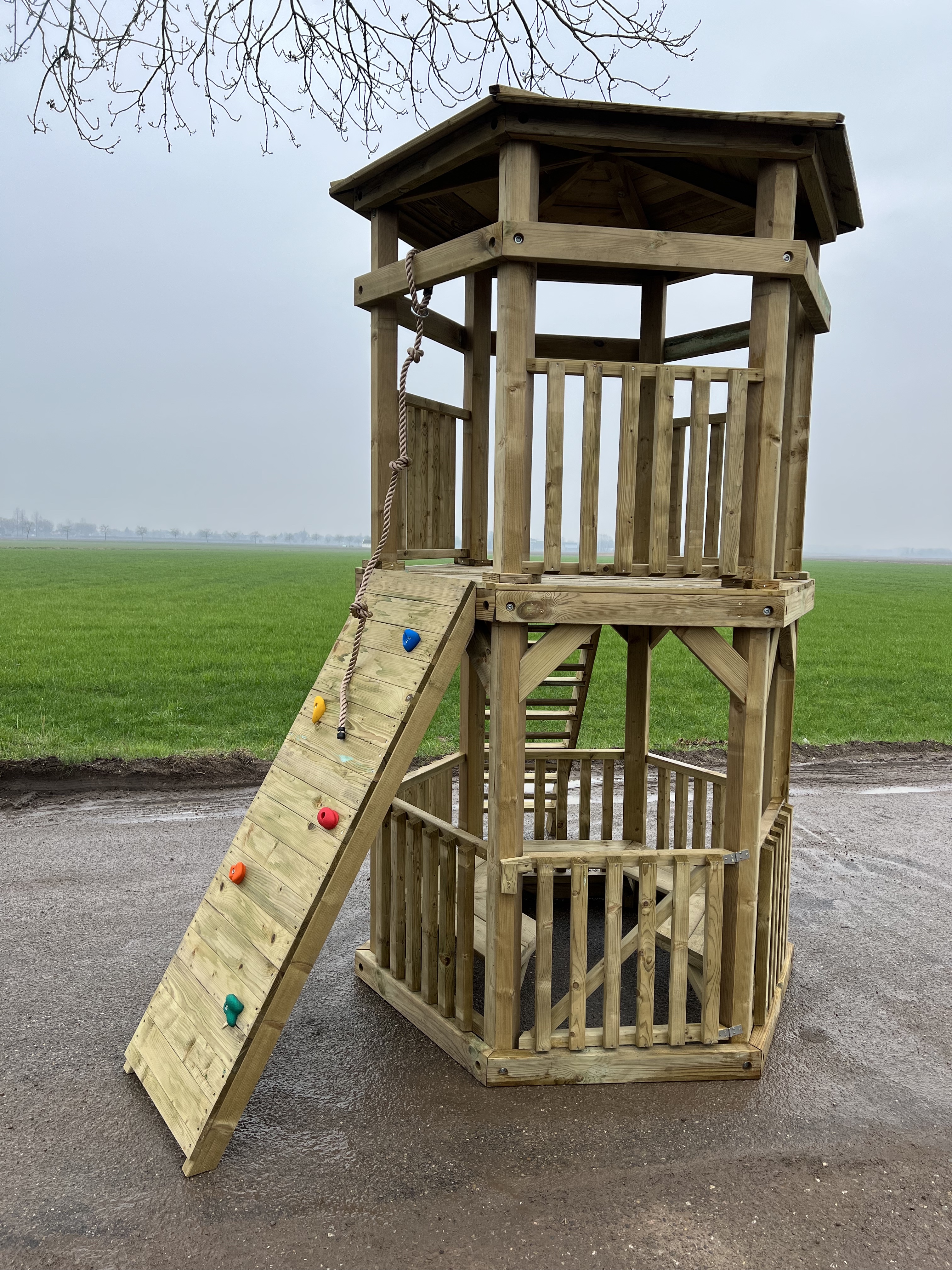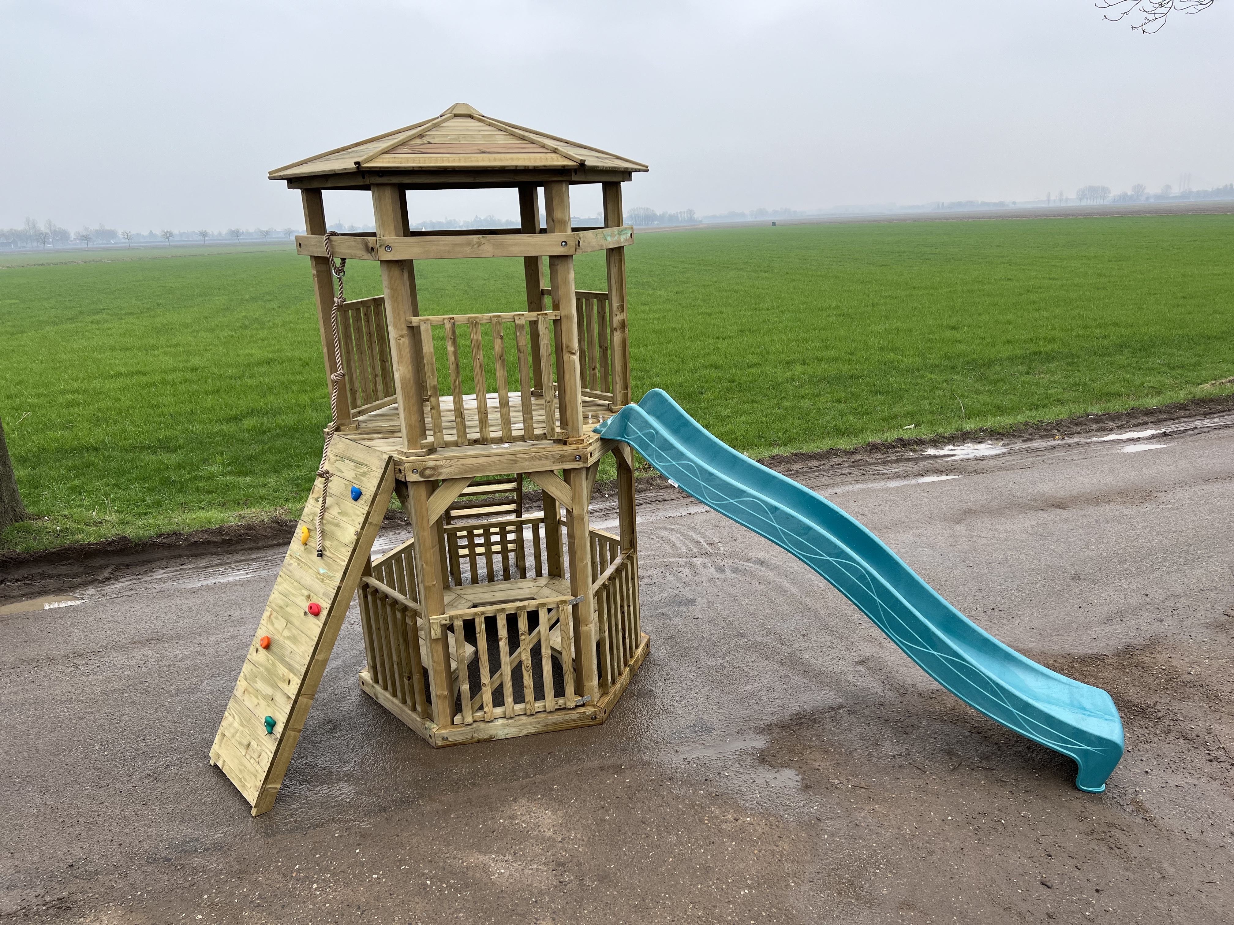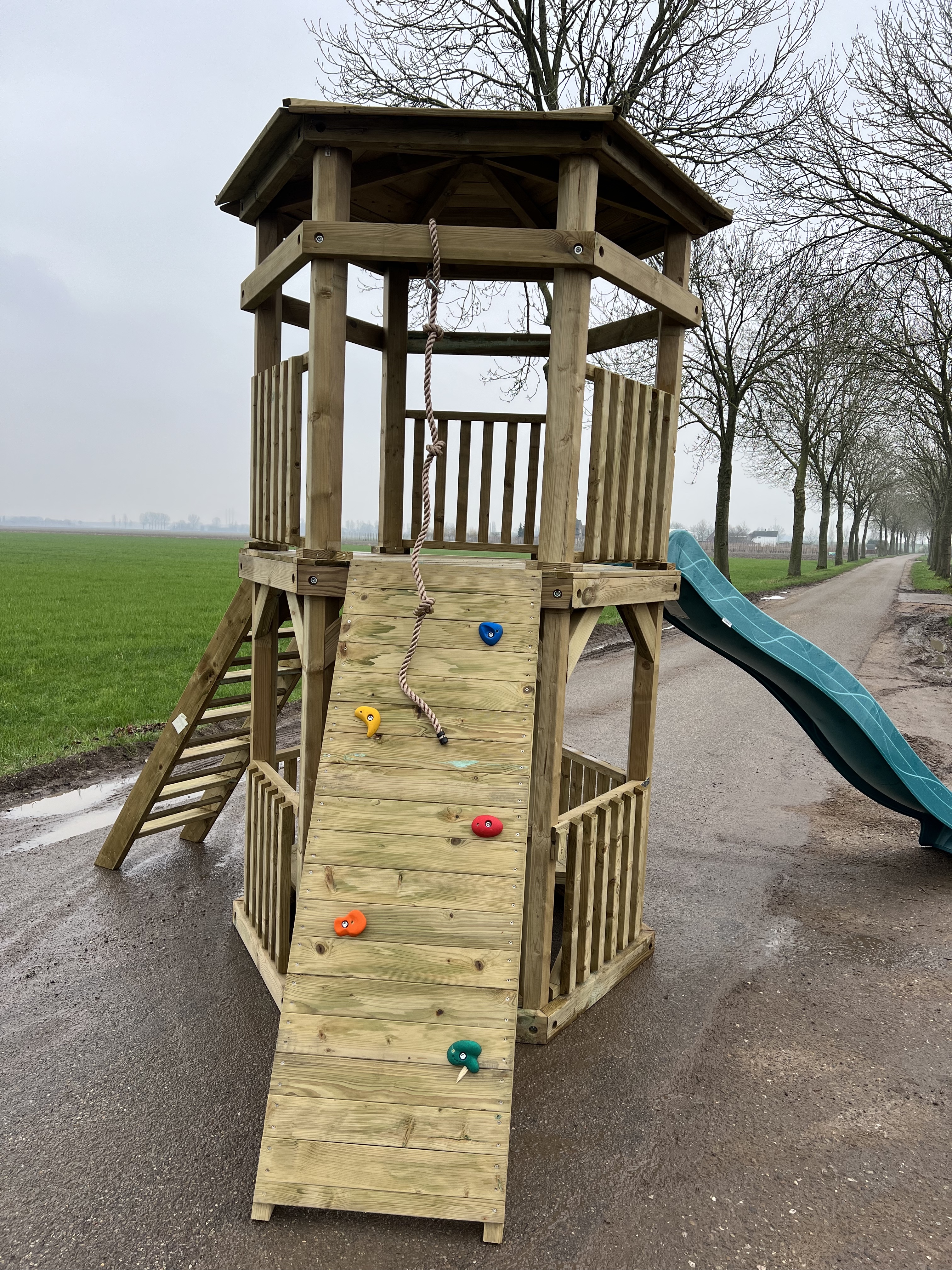 Inculsief: Glijbaan, klimwand met klimstenen, brandweerpaal, veiligheidstrap, grondankers, zeskantig zitgedeelten, rekjes onder, en klimtouw.