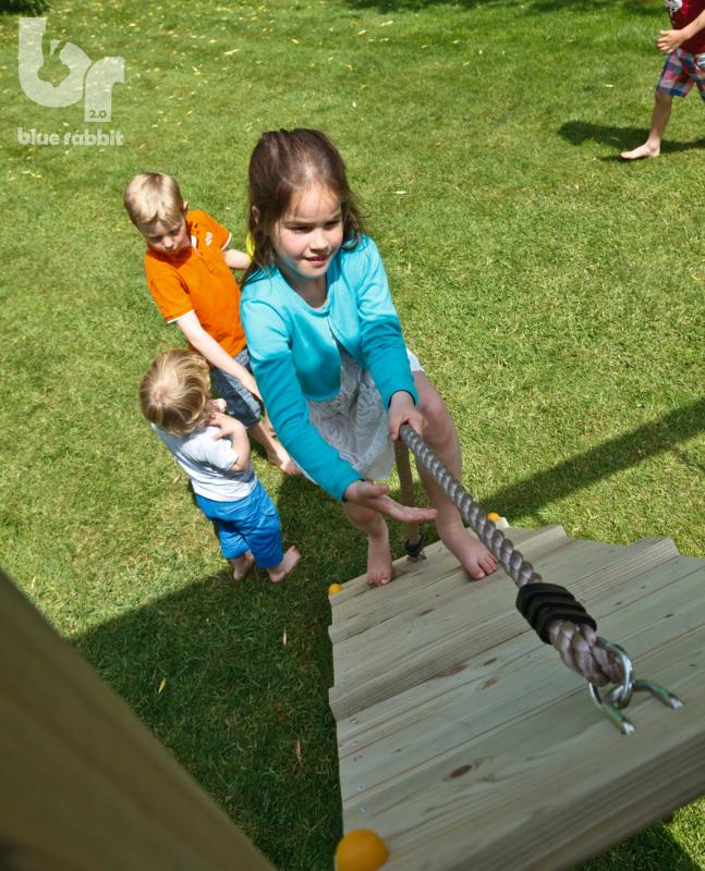 Klauter via de steile helling van de @ramp naar boven. Het dikke touw biedt een uitstekende grip aan kleine kinderhandjes. Dikkere houten balkjes zorgen voor een beetje extra voetensteun tijdens het klimmen.